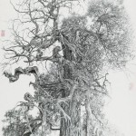 Beijing-based artist Liu Dan, at age 60 one of the “old masters” of this school, paints rocks and trees, two of the key elements of classical Chinese landscape painting. But there’s a difference—Liu’s rocks take up the whole composition, and seen close-up they take on the otherworldly quality of another planet’s surface. His ultra-precise, tiny brushstrokes give his works an almost hyperreal appearance, and in contrast to traditional Chinese ink painting, he rarely adds texts to his paintings, preferring the austerity of the single image. Liu’s trees also tend to occur in isolation, not as part of densely wooded mountain landscapes. For example, his Old Cypress from the Forbidden City (2007), stands against a plain white background, and like many of the rocks it is cropped—the edge of the paper eliminates the bottom of the trunk. This effect increases the viewer’s sense that the natural object is abstracted from nature, another aesthetically contemporary element of today’s Chinese ink painting. In general, the works tend to be large-scale—some as much as 10 feet high—and black and white, although some of the artists use color rather sparingly.