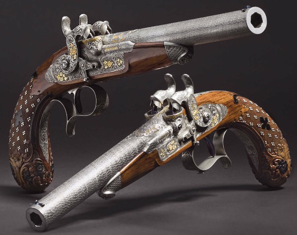 - a pair of deluxe cased percussion pistols for two shots, Anton Vincent Lebeda, Prague, circa 1850.