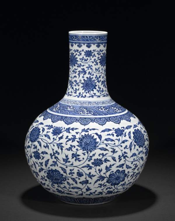 - A blue and white porcelain vase, tianqiuping, Yongzheng (1722–35) mark and period, with interlocking lotus, pomegranate, peony, camellia and seasonal flowers and bands of waves.