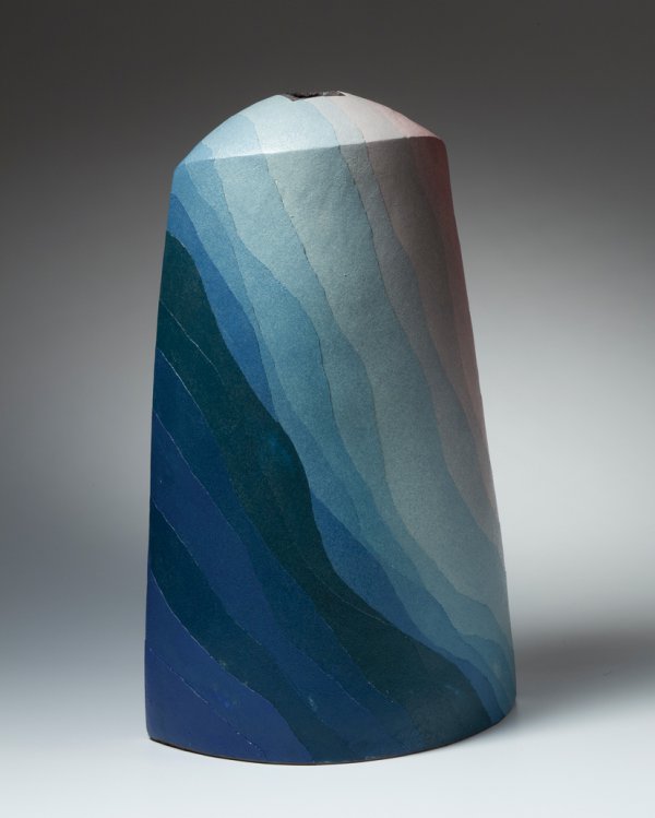 - Miyashita Zenji, Yoru to asa no aida: Between Night and Morning, 2012 , stoneware decorated with carved bandings of colored clay, 22 x 13 x 7 inches;