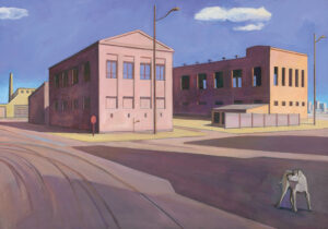 Another of his hallmark series is devoted to scenes of abandoned industrial sites that he began to paint in the 1970s and throughout the following decade or so, such as Backward Glance (1989). Its meticulous architectural rendering is reminiscent of Charles Sheeler or Charles Demuth; its distortions in scale recalling de Chirico’s subtly disturbing dreamlike world, the dog the only inhabitant, the emptiness eerie. Brown said that he felt a growing affinity for the surreal and that it lay at the heart of most artists’ imagination.