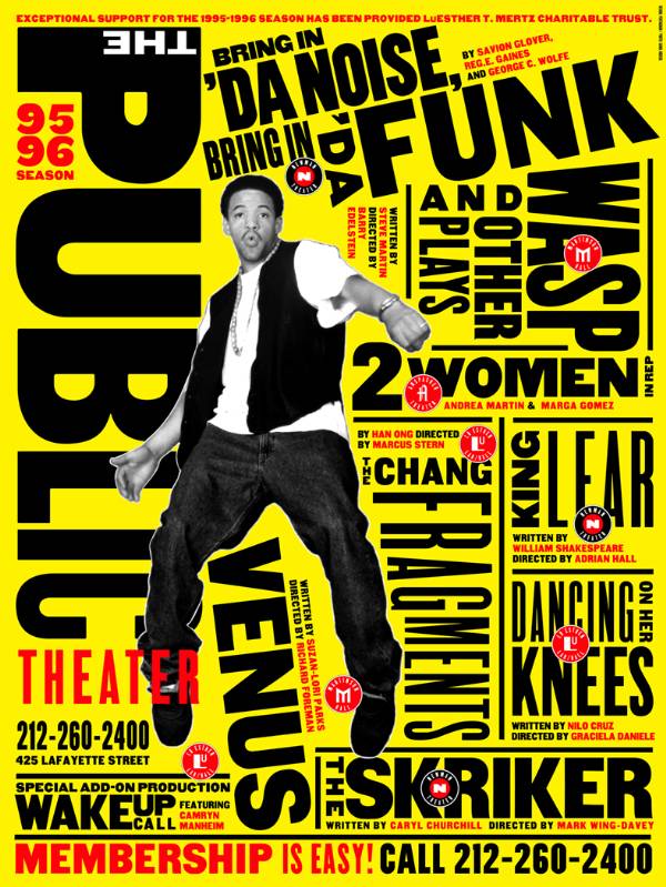 The Public Theater posters will grab your attention no matter what,” says the exhibition’s curator, Kathryn Bloom Hiesinger, “especially her famous poster for Bring in da Noise, Bring in da Funk (1995), with its arrangement of the type in different directions and different sizes and different strengths. It looks like the way the performance will look and sound; it really grabs you, it’s loud.” The poster, which pictures typography dancing all around an image of the show’s star Savion Glover, who is also in motion, is loud to the point of cacophony, yet still somehow Scher, as if leading the viewer through her own dance steps, directs the eye exactly where it should go. No information is lost, and none is unnecessary. Though the Public Theater approached Scher wanting an image that was young and urban, the designer instead looked backward for inspiration. She says, “So, when I when I went back to what theater advertising used to be, back in the day in London, when there was the Old Drury Lane group of theaters—and if you go to London you can still see it painted on the side of the buildings—it would say the name of the play, what time it was, who was in it, and that was it. There was no cute line, no image, just this listing of typography, with lots of different fonts and sizes and scales, and that’s exactly what I did.”