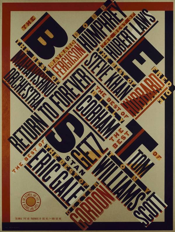 Scher has an innate rebellious streak. In many interviews, including her interview with Art & Antiques, she has discussed the personal war she waged against the typeface Helvetica, which seemed to be, when she was starting out in the field, a dark specter shrouding modern design. Her distaste for the font, she acknowledges, “gave me a career.” In truth, Scher’s early work in record design shows her, not unlike Chwast, using various vintage-inspired fonts and often referencing visual elements that correspond with the sonic elements of the music. “When I was in the music industry,” she says, “I was doing record covers that were typographic and period-oriented and repurposing those fonts. But I wasn’t analyzing; I was just doing it because I thought it was cool.”