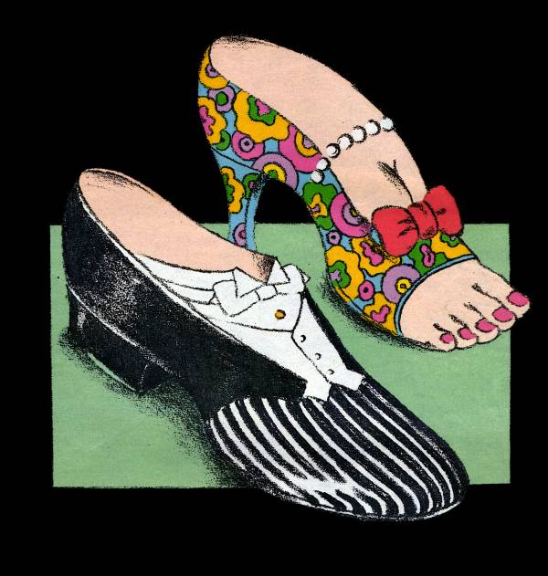 Chwast’s “A,” which he designed for the Indian Ink Company (an ink bottle with the “A” printed on its label, is among the objects in Chwast’s case), is bulbous and almost humanoid. It has the comic quality of a belly sticking out of a too-small T-shirt, or the chunky heel of a platform shoe (shoes are, after all, one of Chwast’s favorite things to draw). It seems to want affection. Where Scher’s work is more bullying toward the viewer—directing him where to look and when—Chwast’s is cajoling. His work often personifies inanimate objects, playing on the impulse to see human faces in things in order to induce sympathy or fondness. His commissioned illustrations, like those for Mobil’s Masterpiece Theater, helped pioneer a style that made the corporate seem cuddly.