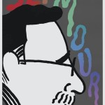 Bold orange, gray, black and white arrows and a shiny text bubble—the type that might appear over a cartoon character’s head—reading “Double Portrait” are arranged at the end of a hallway in the Philadelphia Museum of Art’s steely Perelman Building. They are calling out to the museumgoers who have just turned from the Deco entryway—clicking their heels on the gravel-colored marble floor—and have entered the somewhat overcast, narrow exhibition-space-cum-corridor that leads to a few moderately-sized additional galleries. Not unlike the mysterious and alluring signs painted on the walls at Coney Island, promising wonder and delight down a dark alleyway, the arrows arouse too much curiosity to be ignored. The attraction behind the curtain, as it were, is the first dual exhibition of designer Paula Scher and illustrator Seymour Chwast, two modern masters of mind control.