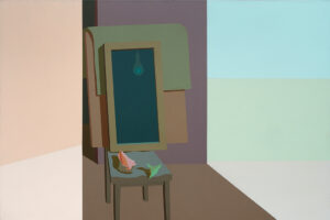 Lundeberg’s work took a more figurative turn in the ’70s, with a reappearance of still life in more or less realistic form, often within a landscape. The landscapes themselves shed some of their hard-edged abstraction, and the frequent inclusion of architectural details such as archways suggests a sort of cool California classicism, bathed in pinkish or bluish light. Her last known painting, Two Mountains, made in 1990, nine years before her death at 91, is a depiction of a snow-capped mountain reflected perfectly in a lake. The colors—salmon pink, teal, blue, and dark orange—are not particularly natural. In this painting, it is the artist, not nature, who is in charge. Despite all the changes in her work over the years, there is a deep consistency to Lundeberg’s career. In her 1942 artist’s statement, she wrote, “I am, apparently, a classicist by nature as well as conviction. By classicism I mean, not traditionalism of any sort, but that highly conscious concern with aesthetic structure which is the antithesis of intuitive, romantic, or realistic approaches to painting.” These words are just as applicable to her last paintings as to her first.