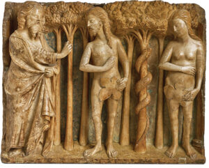 Bartomeu Robió, The Lord Reprimanding Adam and Eve, Spain, c. 1362, alabaster with traces of polychromy, 20 1⁄4 x 25 3⁄4 x 4 3⁄4 in.